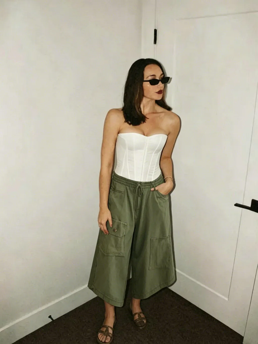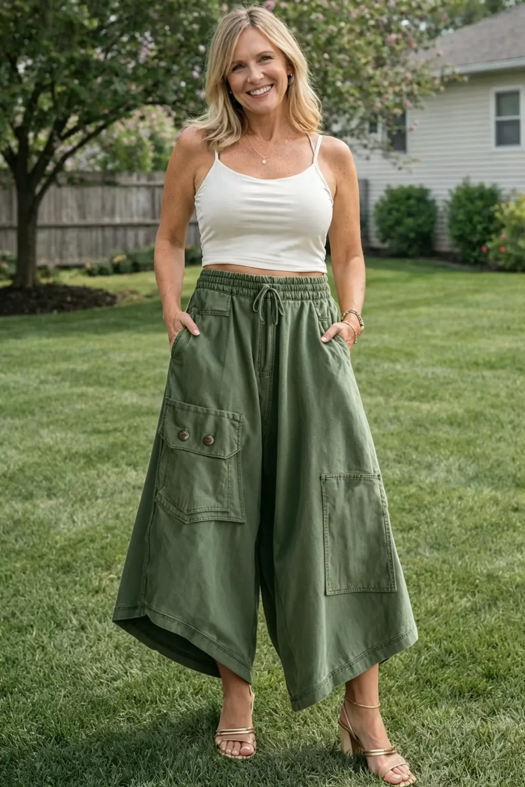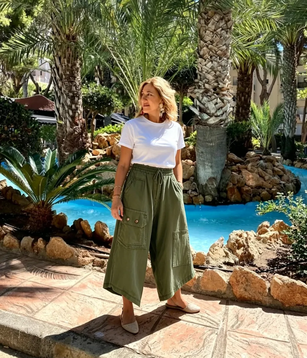 • Footwear: Strappy flat sandals or platform espadrilles