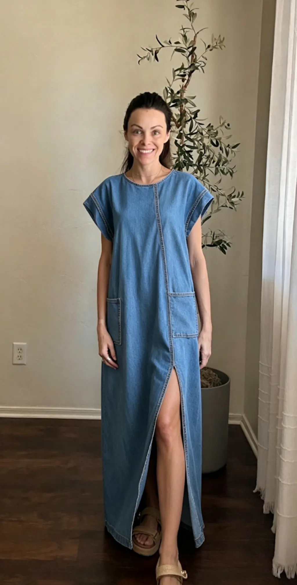 Loose Fit Blue Denim Maxi Dress With Contrast Stitching
