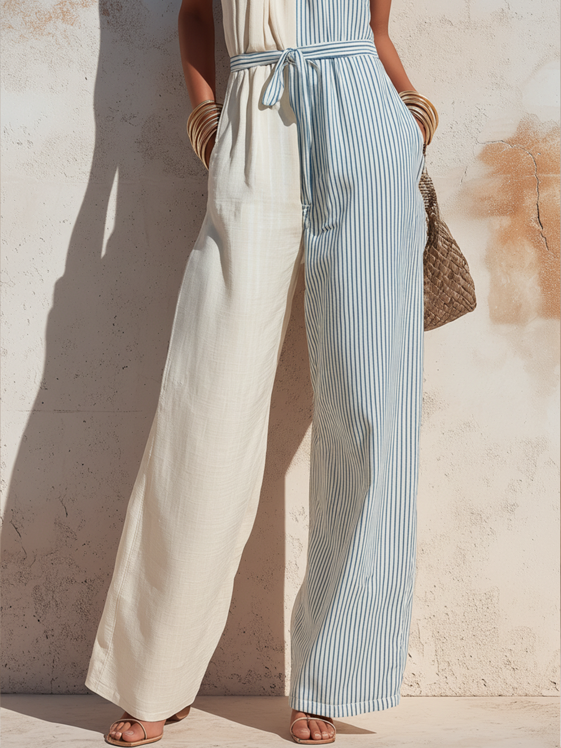Two-Tone Striped Halter Neck Linen Jumpsuit With Belted Waist
